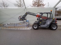 Der "kleine" hat eine Hubkraft von max. 1,2t und eine Hubhöhe von 4,5m. Mit nur 1,6m Breite und seiner Höhe von knapp 2m kommt er auch durch enge Durchfahrten. Er ist aufgrund seiner kompakten Bauweise sehr wendig und übersichtlich.